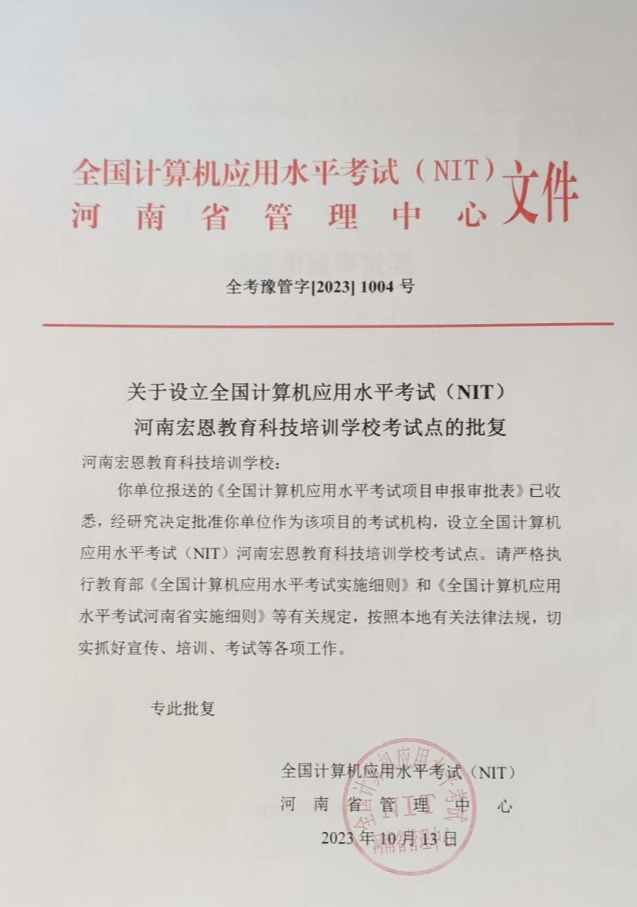 2023年10月13日,全国计算机应用水平考试(NIT)河南省管理中心审核通过在我司设立该项目的考试机构,并设立相应的考试试点,我们将严格执行教育部的相关规定,按照本地有关法律法规,切实抓好宣传、培训、考试等各项工作