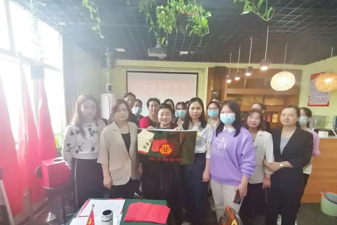 8.中原区林山寨街道妇联主席王林琰。中原区林山寨街道妇联副主席金玲向河南宏恩教育科技有限公司妇女联合会授牌: