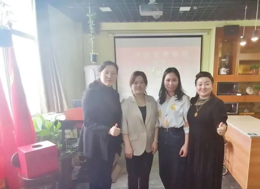 河南宏恩教育科技有限公司妇女联合会第一届主席耿雪玲、副主席宋其云与中原区林山寨街道妇联主席王林琰。中原区林山寨街道妇联副主席金玲合影留念 。